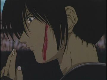 That night, Kenshin is at work again, with more enemies of the clans dead from his sword. As he is met by Iizuka, he notices that the cut has began to bleed again. Iizuka tells him of a superstition that if a wound is inflicted by one with a strong hatred, the wound will not heal until revenge has been exacted.